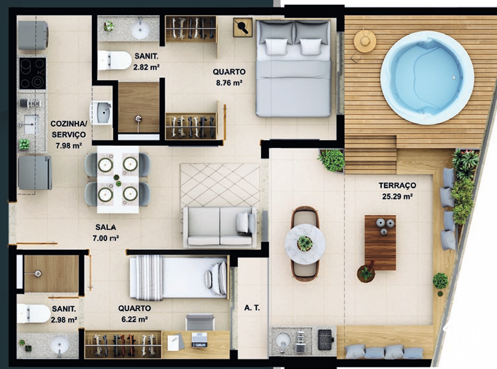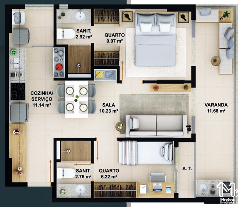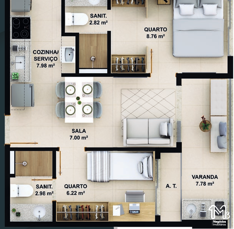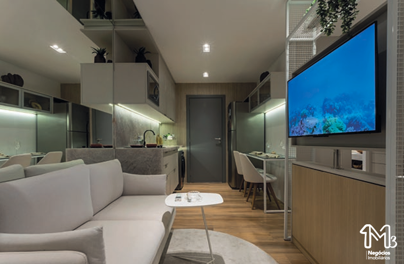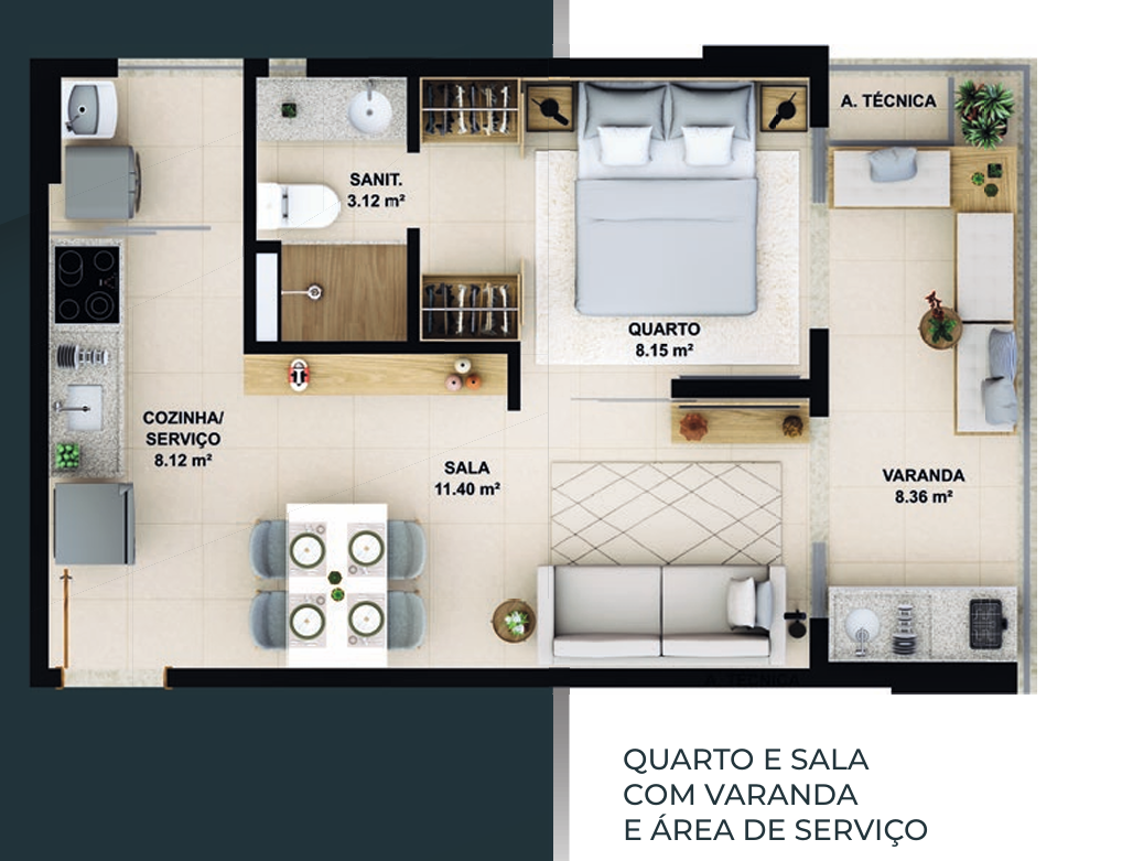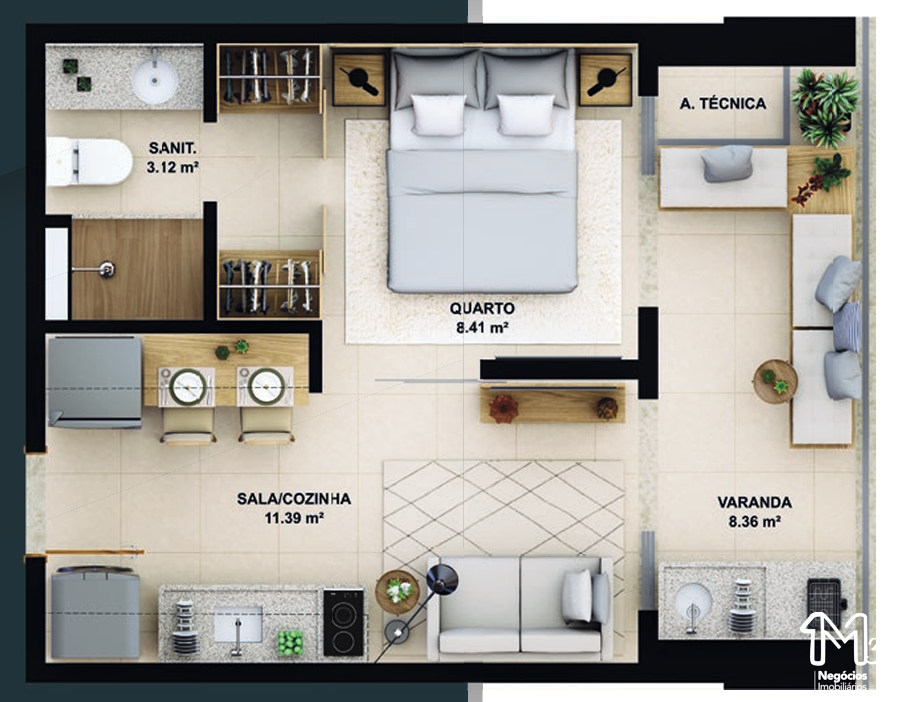 – Quarto e sala com área de serviço e varanda integrada 39,15m²;