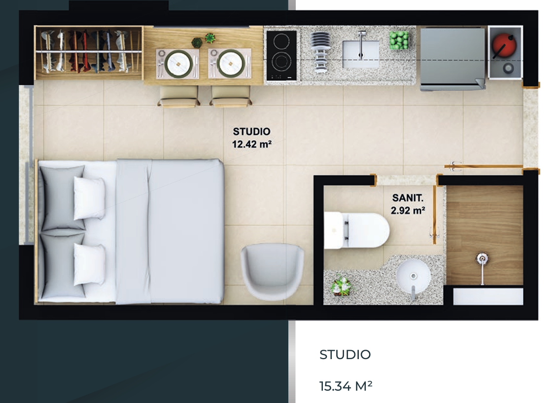 – Studio com 15,34m²;