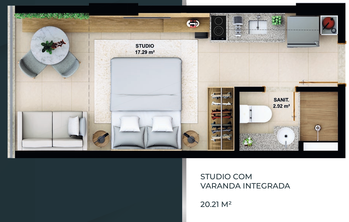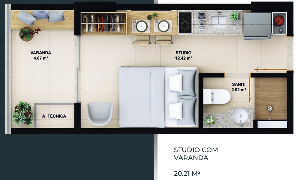 – Studio com varanda 20,21m²;