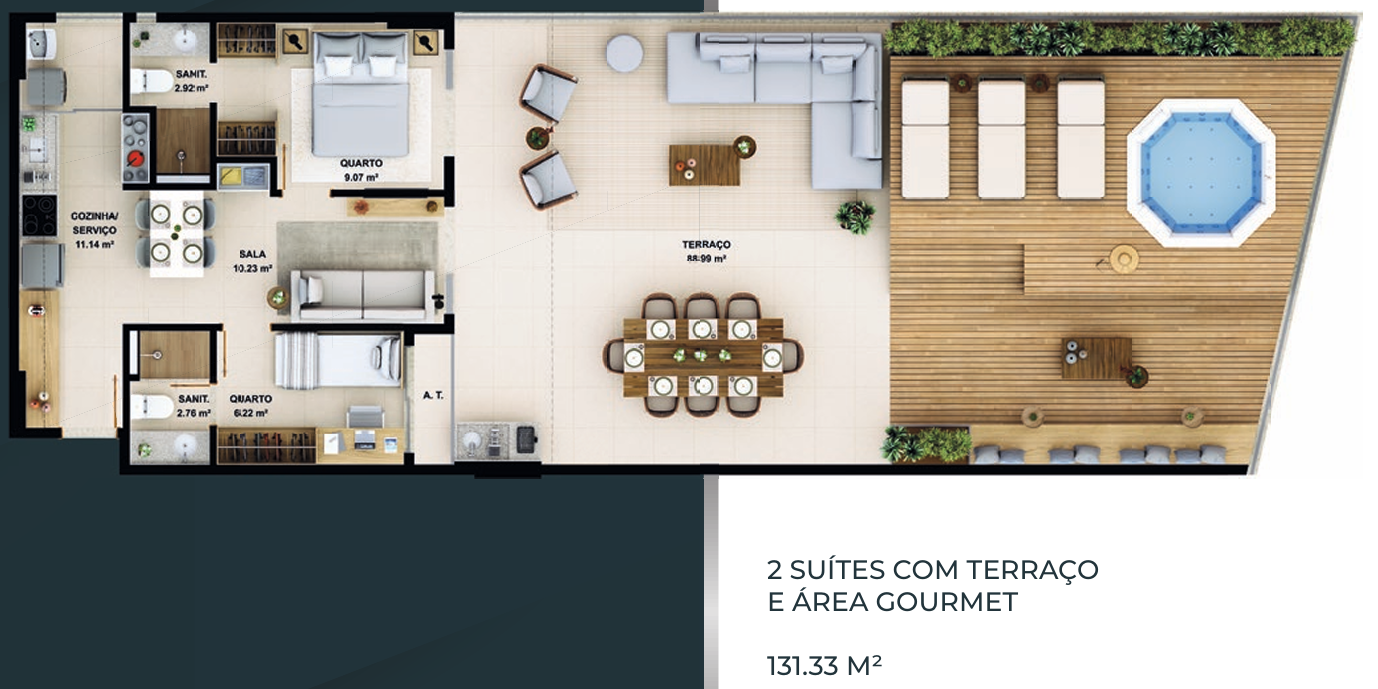 – 2 suítes com terraço e área gourmet 131,33m²;