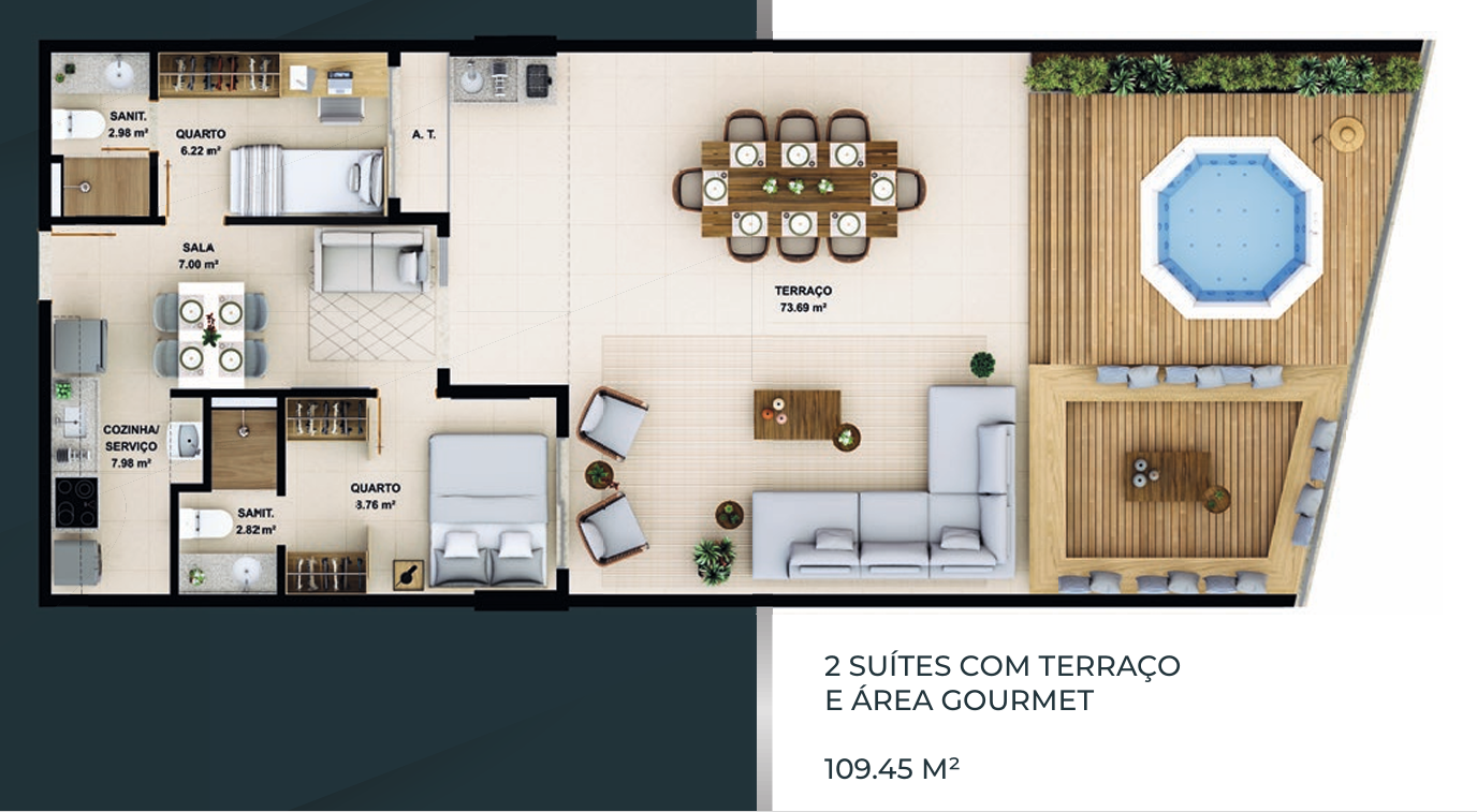 – 2 suítes com terraço e área gourmet 109,45m²;