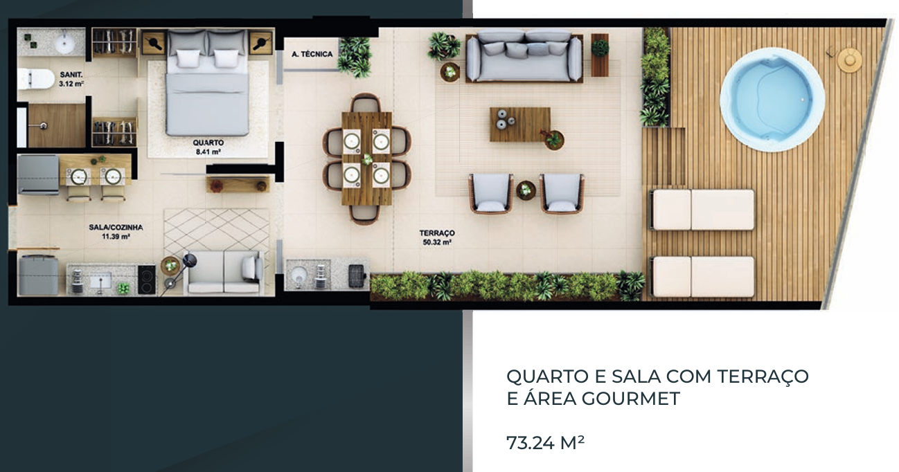 – Quarto e sala com terraço e área gourmet 73,24m²;