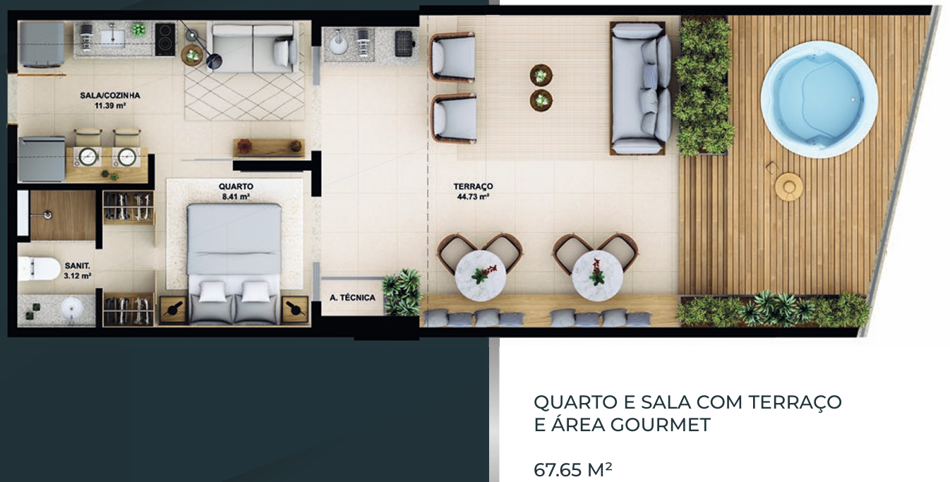 – Quarto e sala com terraço e área gourmet 67,65m²;