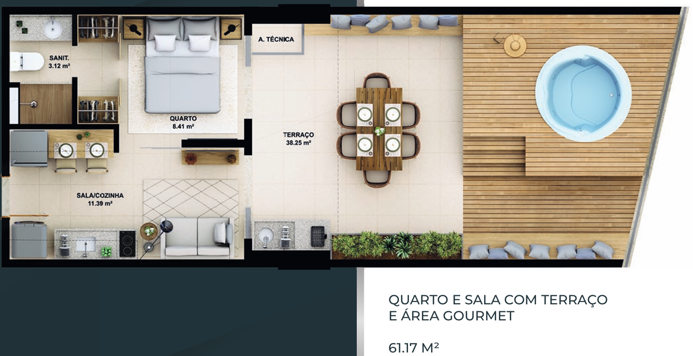 – Quarto e sala com terraço e área gourmet 61,17m²;