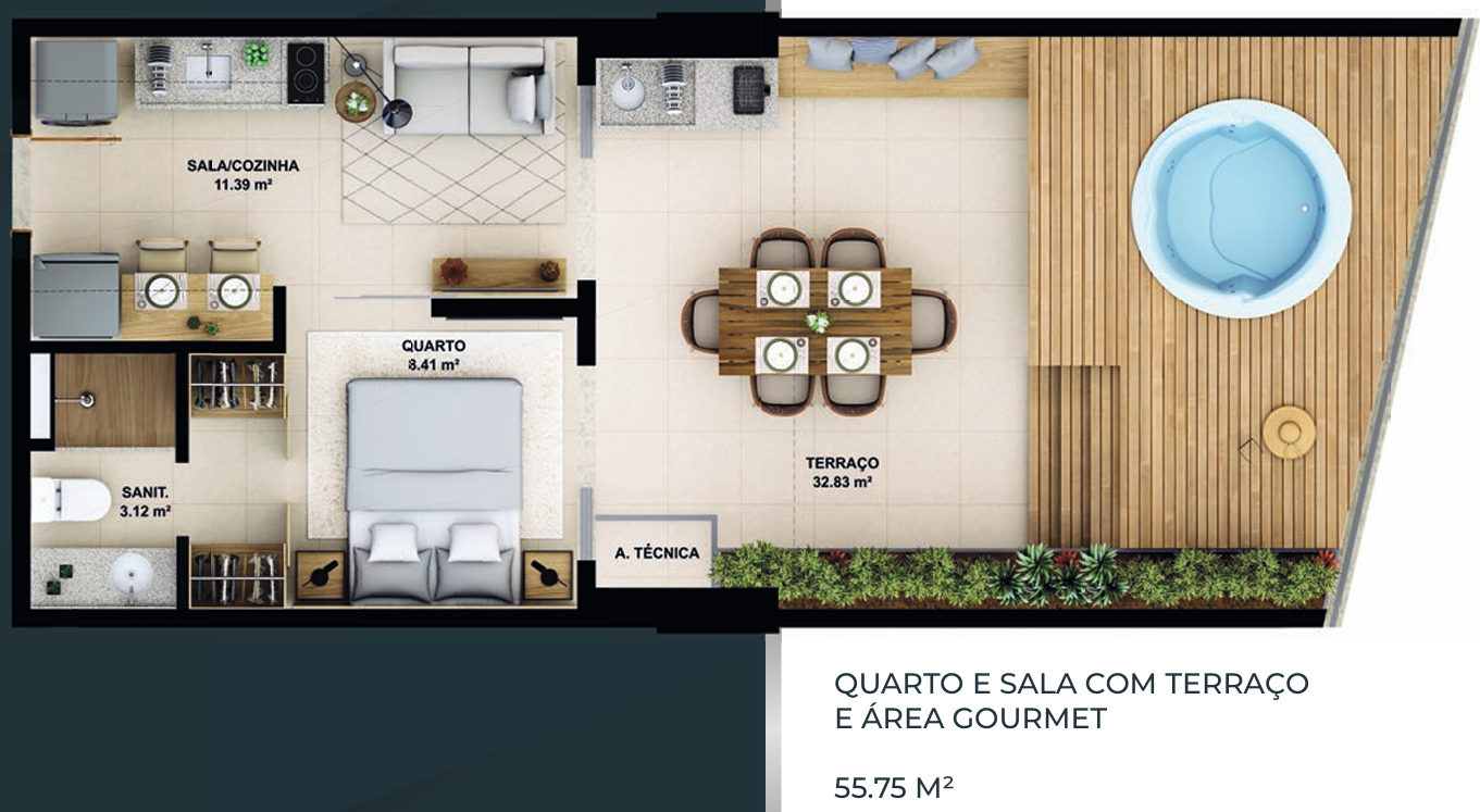 – Quarto e sala com terraço e área gourmet 55,75m²;
