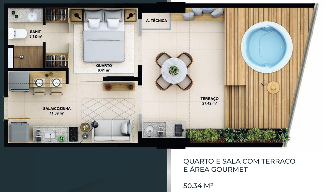 – Quarto e sala com terraço e área gourmet 50,34m²;