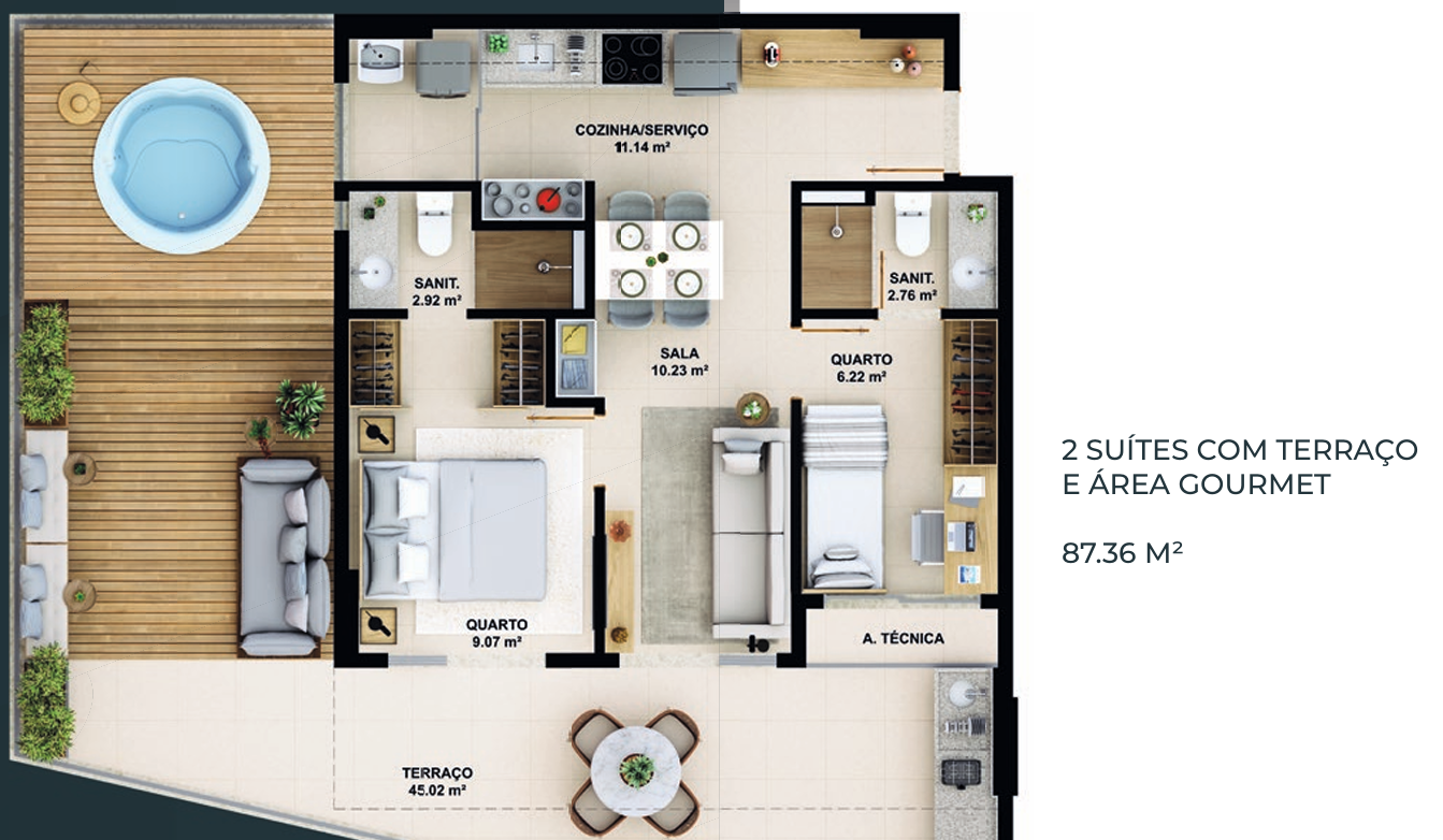 – 2 suítes com terraço e área gourmet 87,36m².